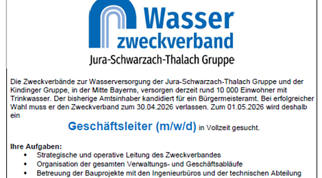 Stellenausschreibung Geschäftsleiter (m/w/d) für den Wasserzweckverband Jura-Schwarzach-Thalach Gruppe