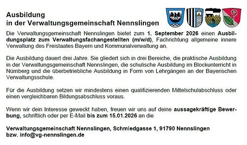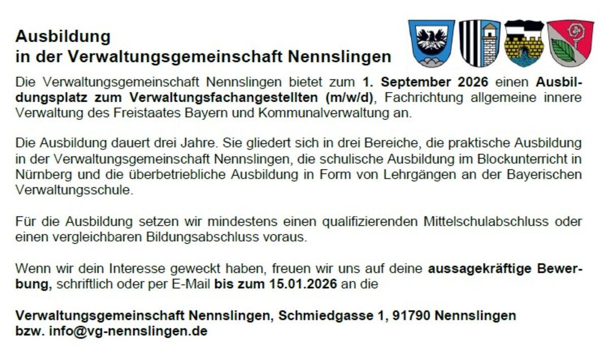 Die Verwaltungsgemeinschaft Nennslingen bietet zum 1. September 2026 einen Ausbildungsplatz zum Verwaltungsfachangestellten (m/w/d), Fachrichtung allgemeine innere Verwaltung des Freistaates Bayern und Kommunalverwaltung, an.