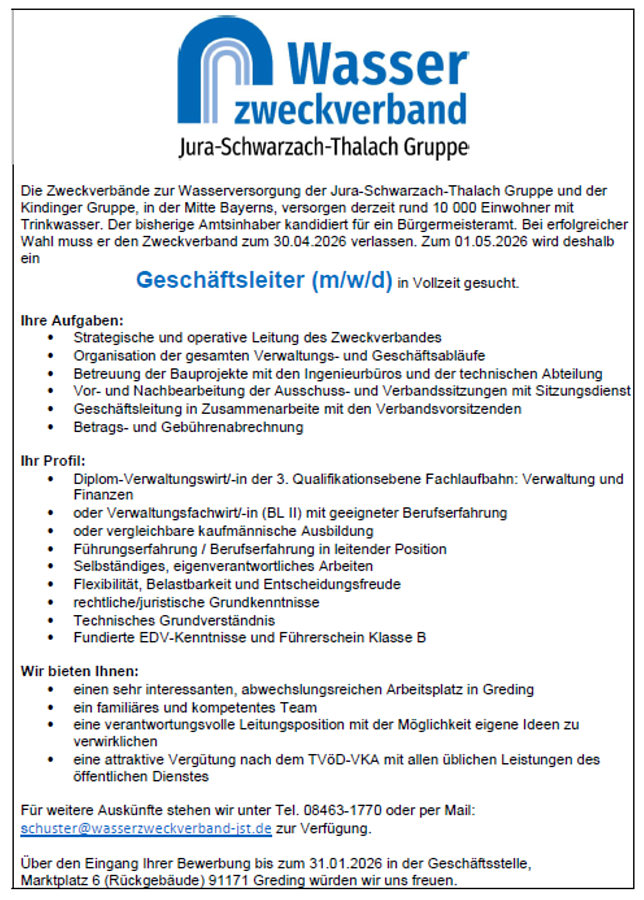 Stellenausschreibung Geschäftsleiter (m/w/d) für den Wasserzweckverband Jura-Schwarzach-Thalach Gruppe
